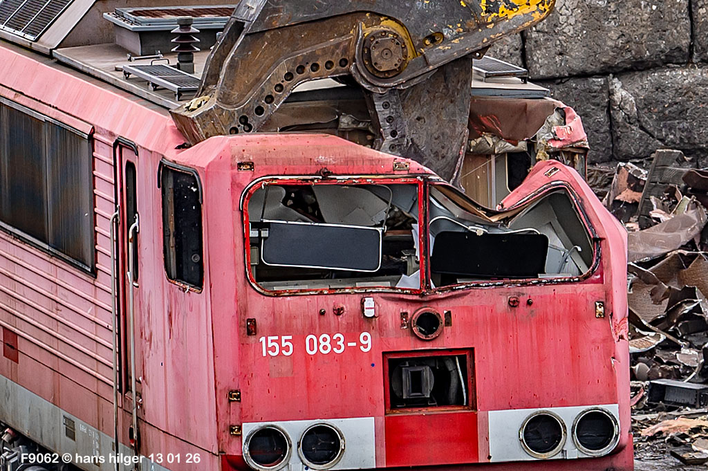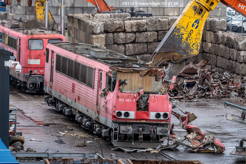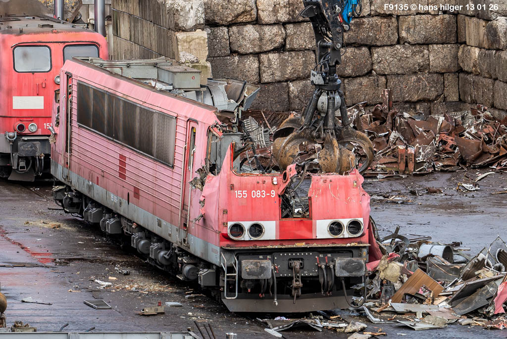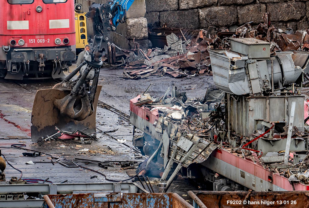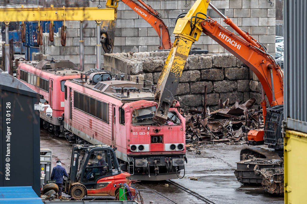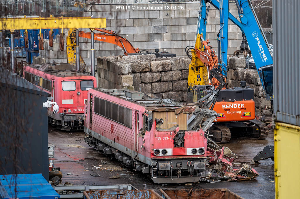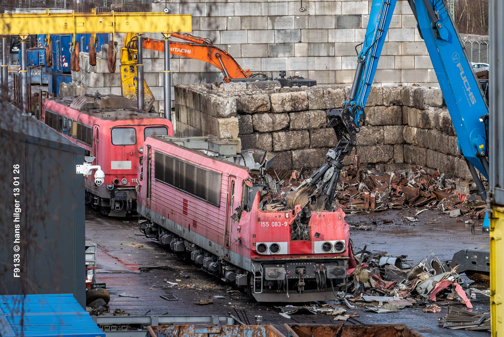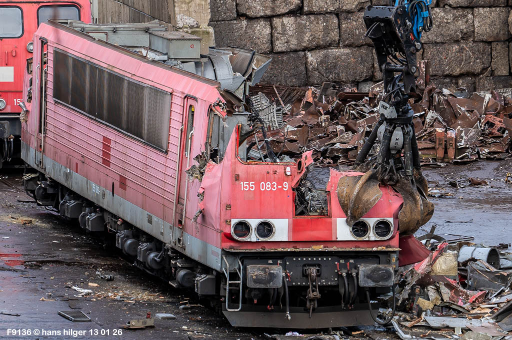 Diese Verschrottung vom 13. Januar 2026 konnte mehr oder weniger zufällig eingefangen werden: Grundsätzlich ist es nicht kalkulierbar, wann eine angelieferte Lok wirklich klein gemacht wird, oft war die Anreise nach Opladen vergebens oder wurde abgebrochen, wenn Fotografen sichtbar wurden. Dieses Mal hatte ich Glück und die komplette Zerlegung konnte dokumentiert werden bis zum Abheben des Rahmens, also der Festlegung, welches Zerlegedatum in der Statistik eingetragen wird = An diesem Tag also hatte ich die Ehre, das Datum zu definieren, das für alle Zeiten das Ende der 155 083 beschreibt. Diese Doku steht auch beispielhaft für mehr als 3000 andere Zerlegungen, die hier bereits stattgefunden haben beim Verwerter ihres Vertrauens. Bitte sehr: Das Ende der 155 083, Vorhang auf . . .