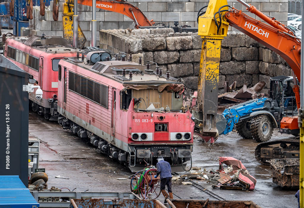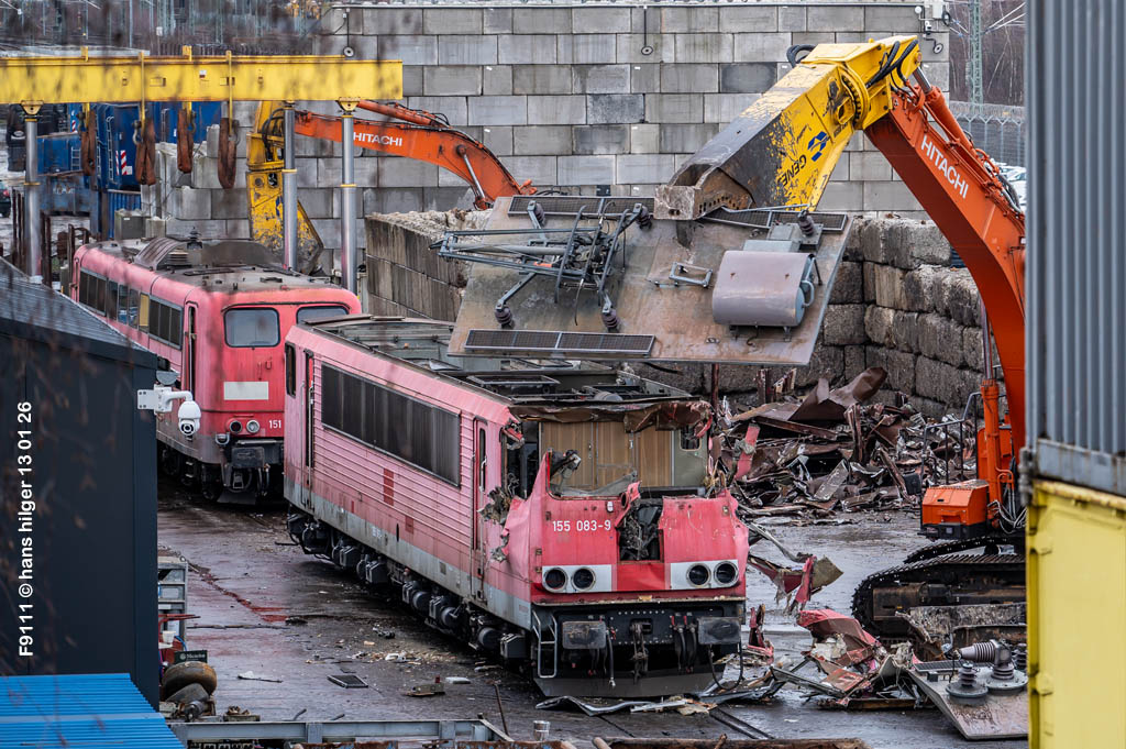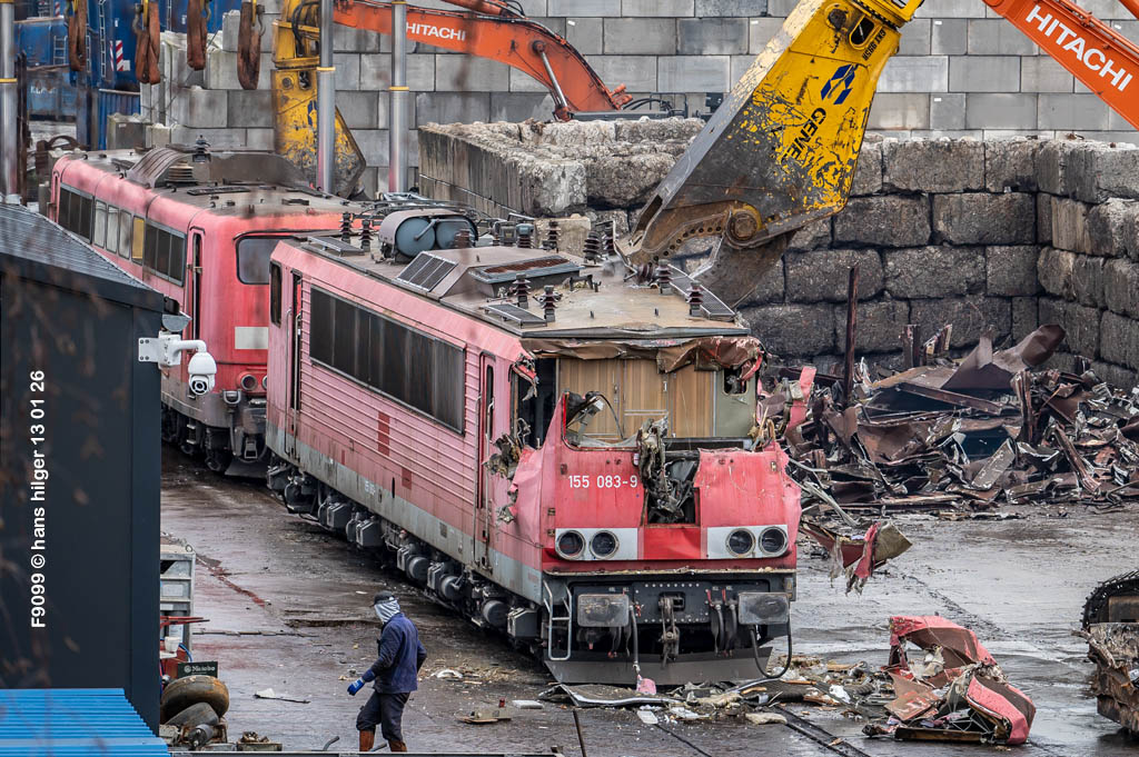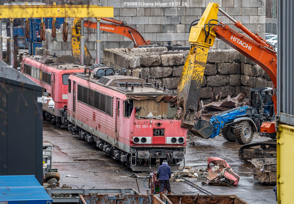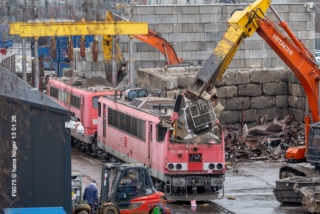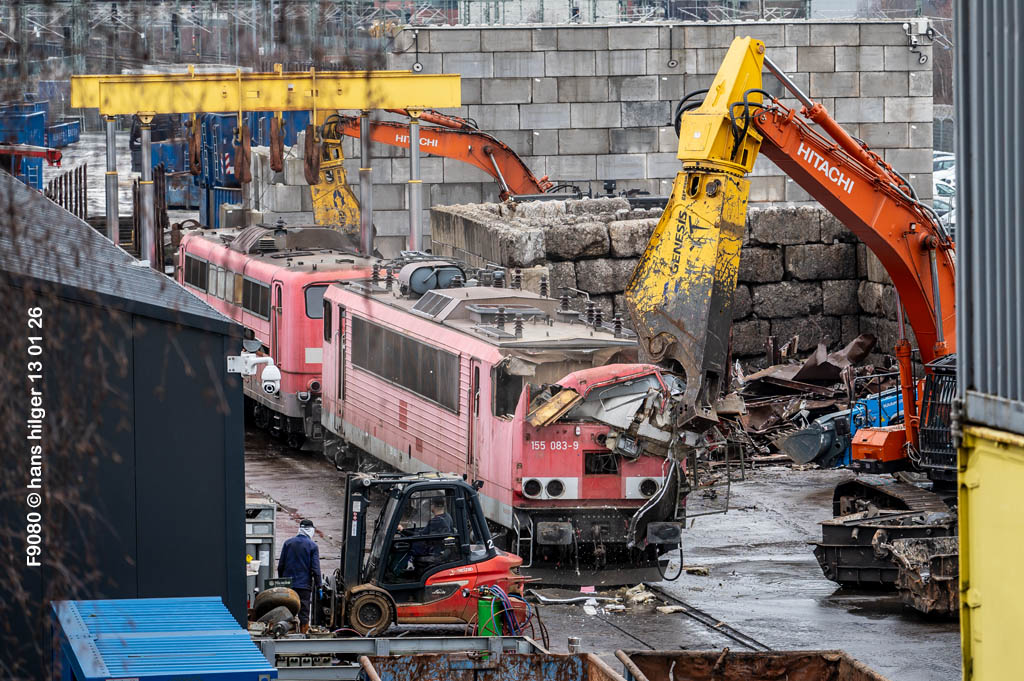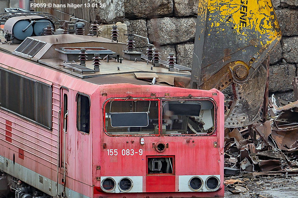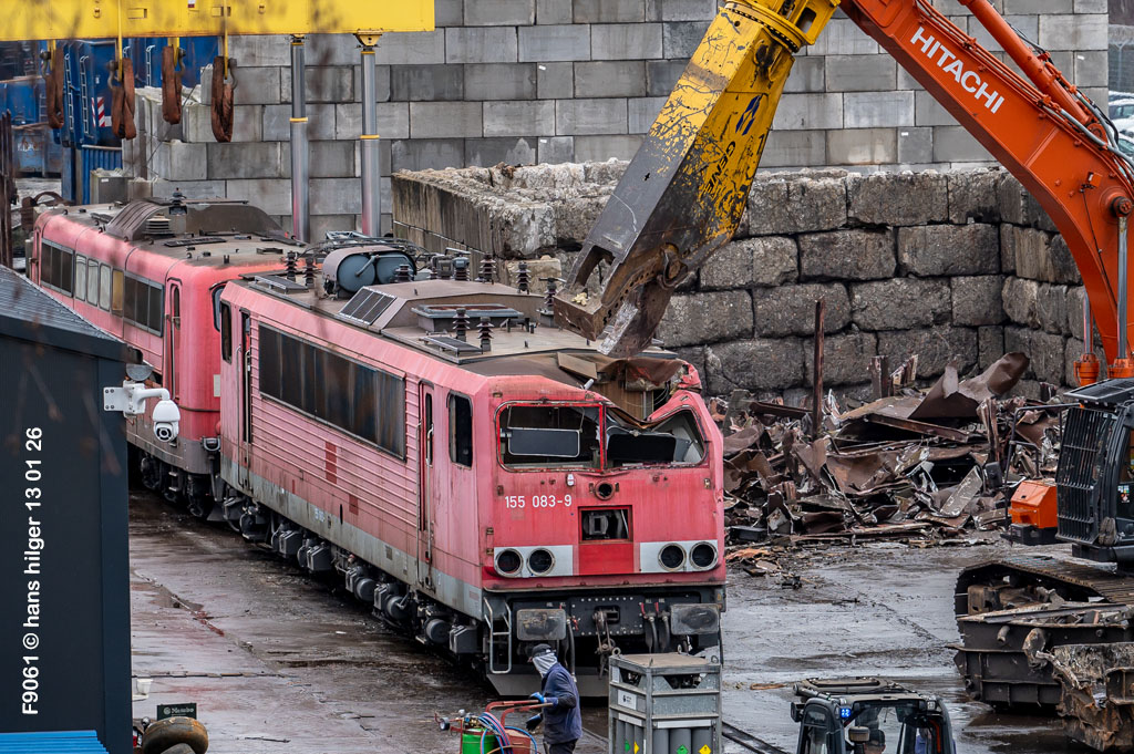 Diese Verschrottung vom 13. Januar 2026 konnte mehr oder weniger zufällig eingefangen werden: Grundsätzlich ist es nicht kalkulierbar, wann eine angelieferte Lok wirklich klein gemacht wird, oft war die Anreise nach Opladen vergebens oder wurde abgebrochen, wenn Fotografen sichtbar wurden. Dieses Mal hatte ich Glück und die komplette Zerlegung konnte dokumentiert werden bis zum Abheben des Rahmens, also der Festlegung, welches Zerlegedatum in der Statistik eingetragen wird = An diesem Tag also hatte ich die Ehre, das Datum zu definieren, das für alle Zeiten das Ende der 155 083 beschreibt. Diese Doku steht auch beispielhaft für mehr als 3000 andere Zerlegungen, die hier bereits stattgefunden haben beim Verwerter ihres Vertrauens. Bitte sehr: Das Ende der 155 083, Vorhang auf . . .