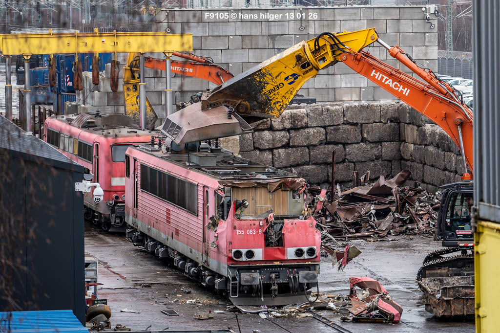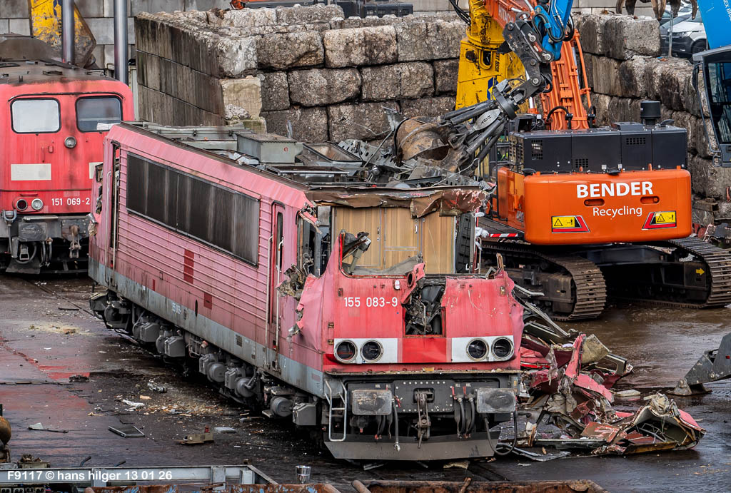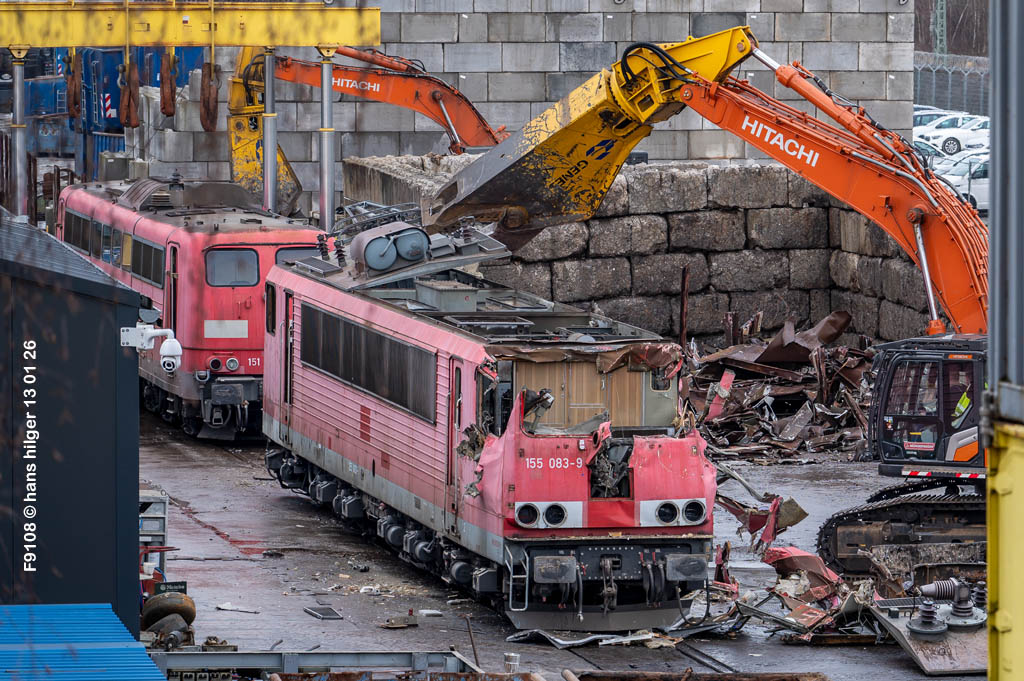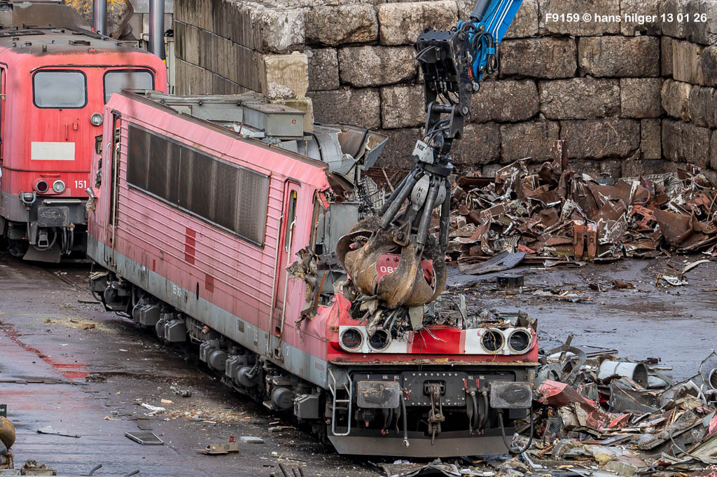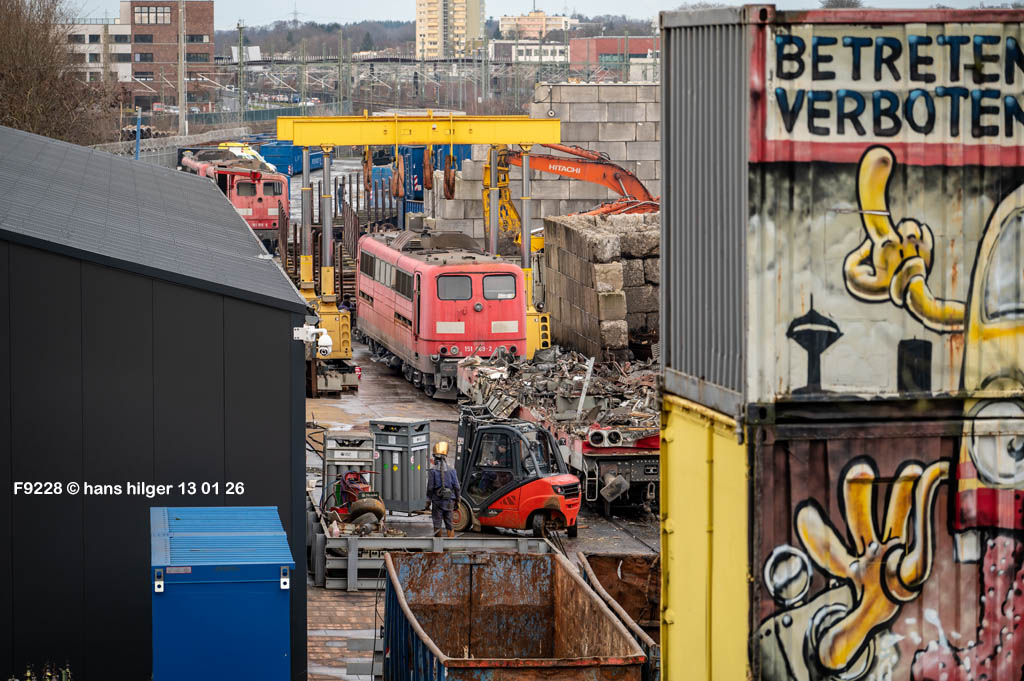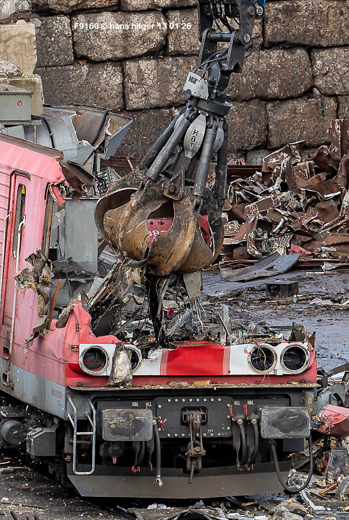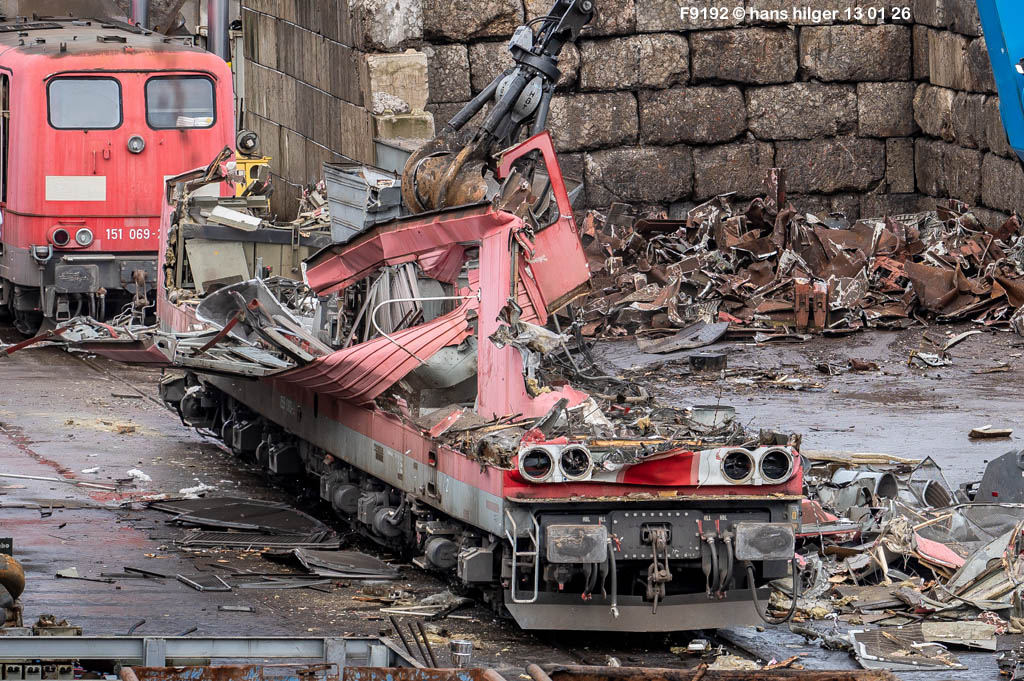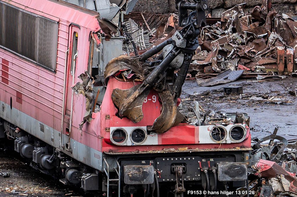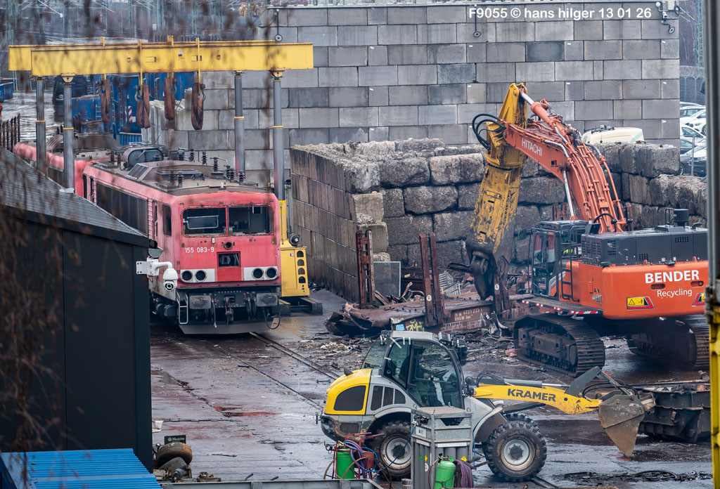 Diese Verschrottung vom 13. Januar 2026 konnte mehr oder weniger zufällig eingefangen werden: Grundsätzlich ist es nicht kalkulierbar, wann eine angelieferte Lok wirklich klein gemacht wird, oft war die Anreise nach Opladen vergebens oder wurde abgebrochen, wenn Fotografen sichtbar wurden. Dieses Mal hatte ich Glück und die komplette Zerlegung konnte dokumentiert werden bis zum Abheben des Rahmens, also der Festlegung, welches Zerlegedatum in der Statistik eingetragen wird = An diesem Tag also hatte ich die Ehre, das Datum zu definieren, das für alle Zeiten das Ende der 155 083 beschreibt. Diese Doku steht auch beispielhaft für mehr als 3000 andere Zerlegungen, die hier bereits stattgefunden haben beim Verwerter ihres Vertrauens. Bitte sehr: Das Ende der 155 083, Vorhang auf . . .
