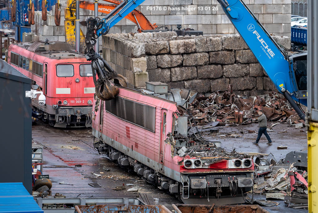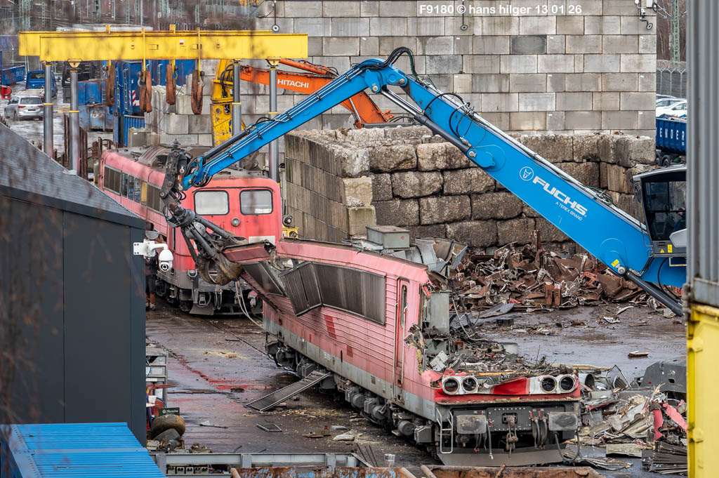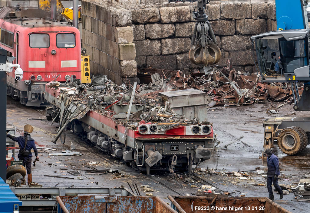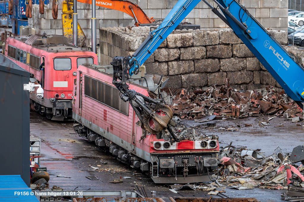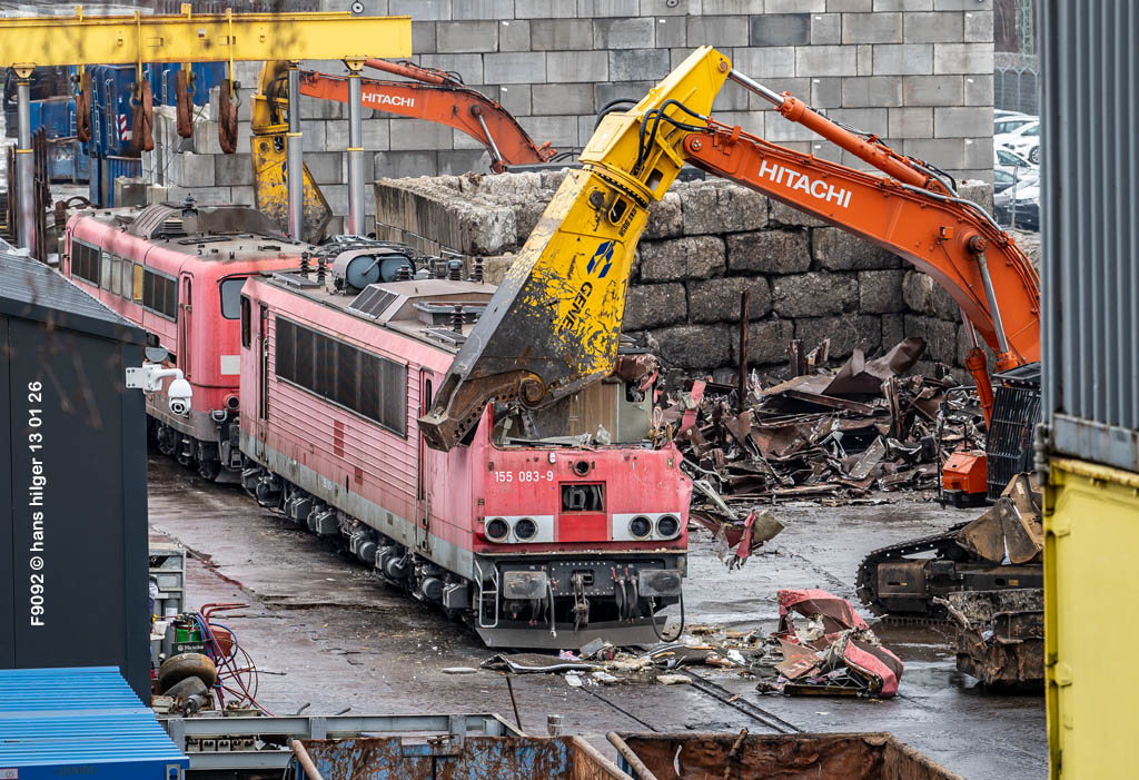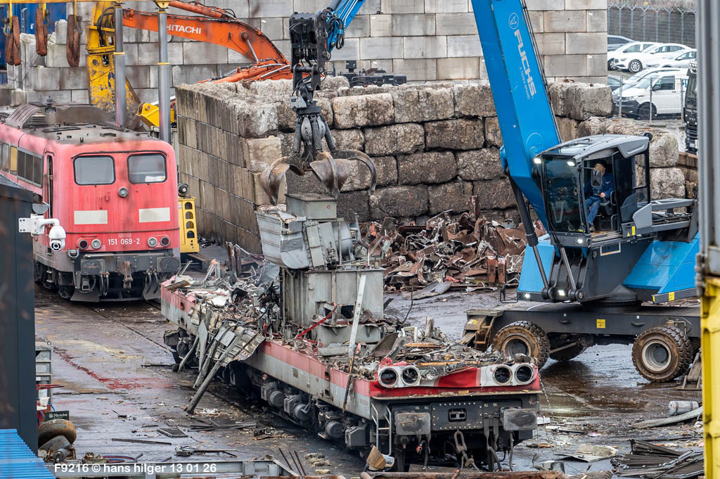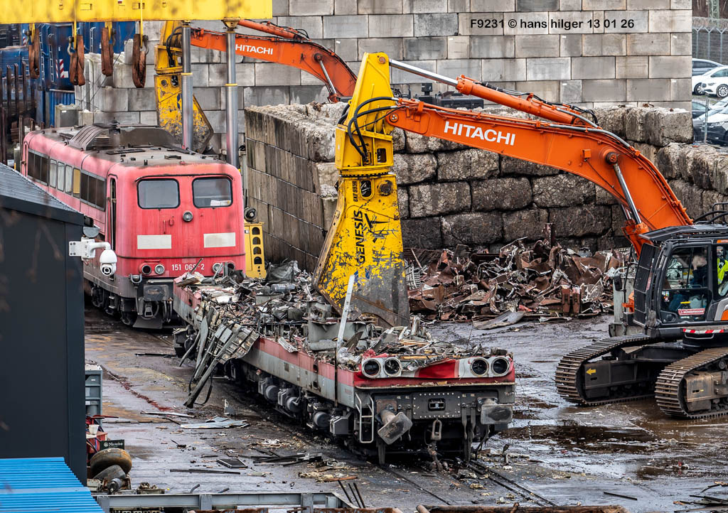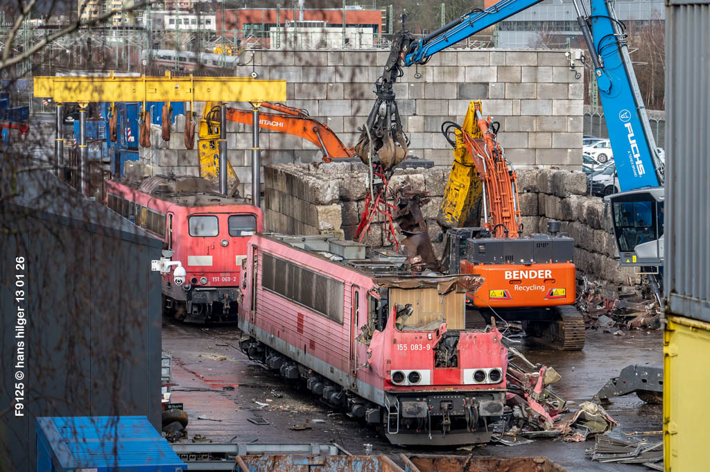 Diese Verschrottung vom 13. Januar 2026 konnte mehr oder weniger zufällig eingefangen werden: Grundsätzlich ist es nicht kalkulierbar, wann eine angelieferte Lok wirklich klein gemacht wird, oft war die Anreise nach Opladen vergebens oder wurde abgebrochen, wenn Fotografen sichtbar wurden. Dieses Mal hatte ich Glück und die komplette Zerlegung konnte dokumentiert werden bis zum Abheben des Rahmens, also der Festlegung, welches Zerlegedatum in der Statistik eingetragen wird = An diesem Tag also hatte ich die Ehre, das Datum zu definieren, das für alle Zeiten das Ende der 155 083 beschreibt. Diese Doku steht auch beispielhaft für mehr als 3000 andere Zerlegungen, die hier bereits stattgefunden haben beim Verwerter ihres Vertrauens. Bitte sehr: Das Ende der 155 083, Vorhang auf . . .