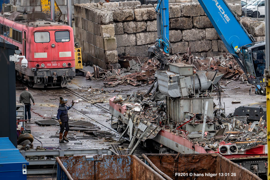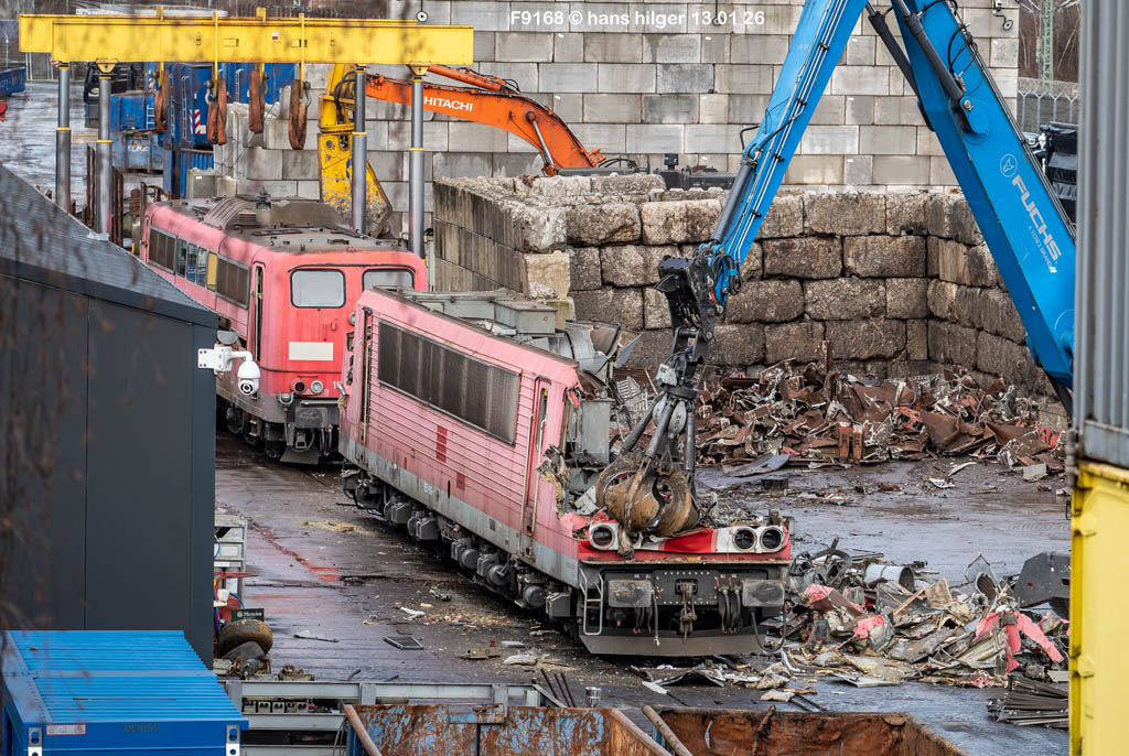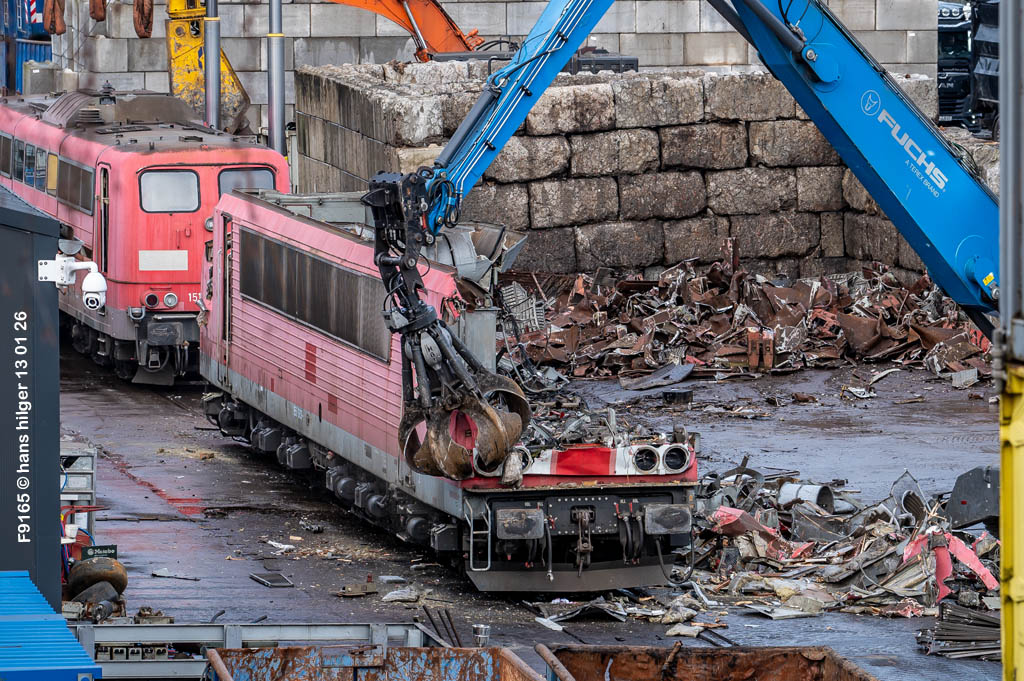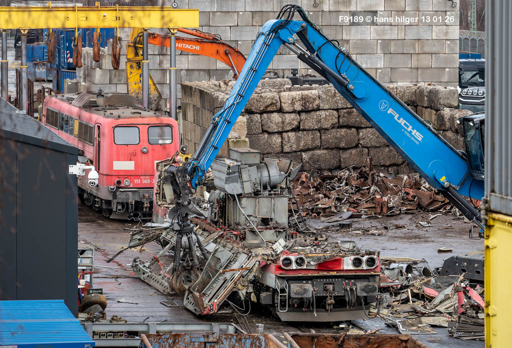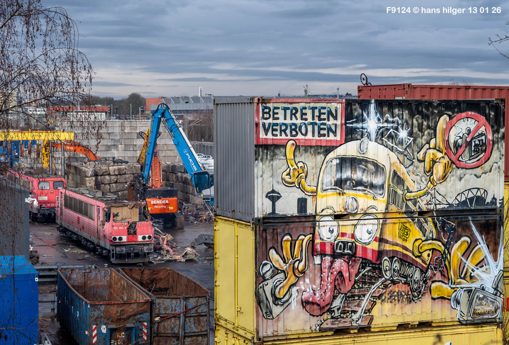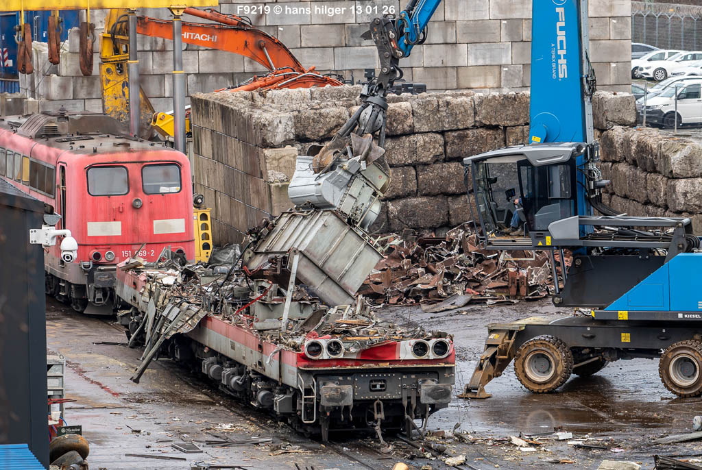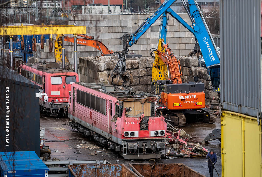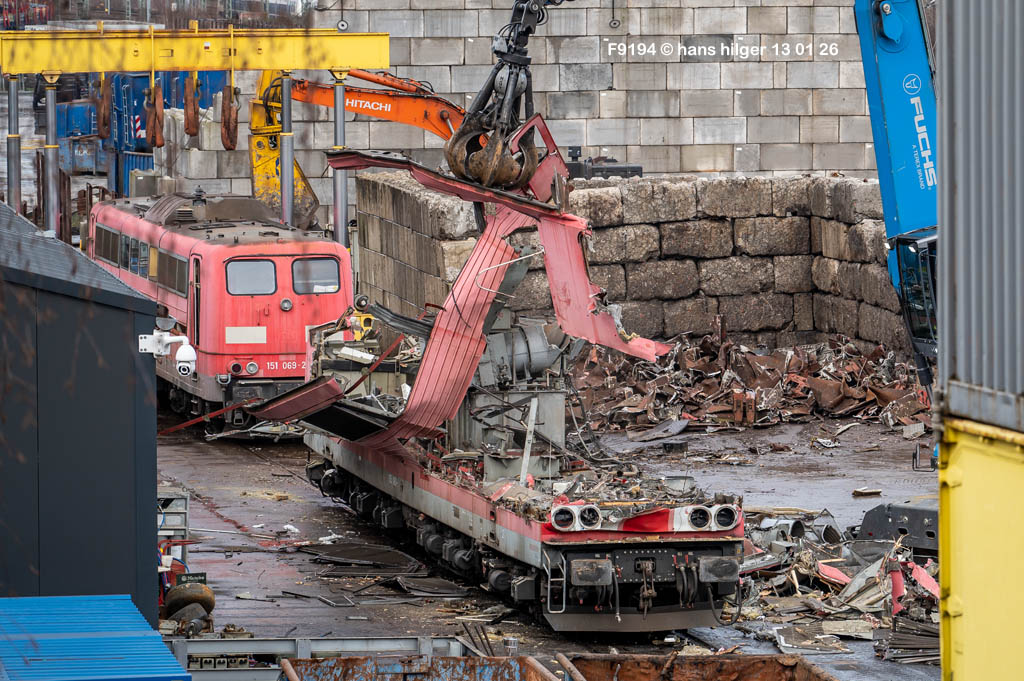 Diese Verschrottung vom 13. Januar 2026 konnte mehr oder weniger zufällig eingefangen werden: Grundsätzlich ist es nicht kalkulierbar, wann eine angelieferte Lok wirklich klein gemacht wird, oft war die Anreise nach Opladen vergebens oder wurde abgebrochen, wenn Fotografen sichtbar wurden. Dieses Mal hatte ich Glück und die komplette Zerlegung konnte dokumentiert werden bis zum Abheben des Rahmens, also der Festlegung, welches Zerlegedatum in der Statistik eingetragen wird = An diesem Tag also hatte ich die Ehre, das Datum zu definieren, das für alle Zeiten das Ende der 155 083 beschreibt. Diese Doku steht auch beispielhaft für mehr als 3000 andere Zerlegungen, die hier bereits stattgefunden haben beim Verwerter ihres Vertrauens. Bitte sehr: Das Ende der 155 083, Vorhang auf . . .