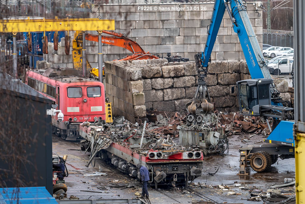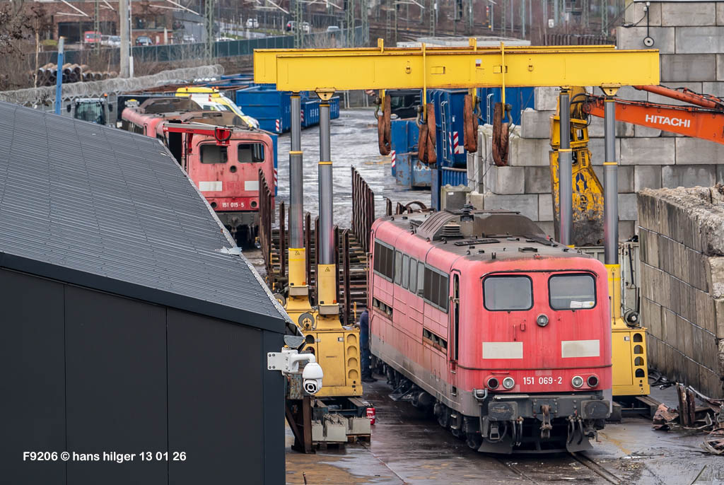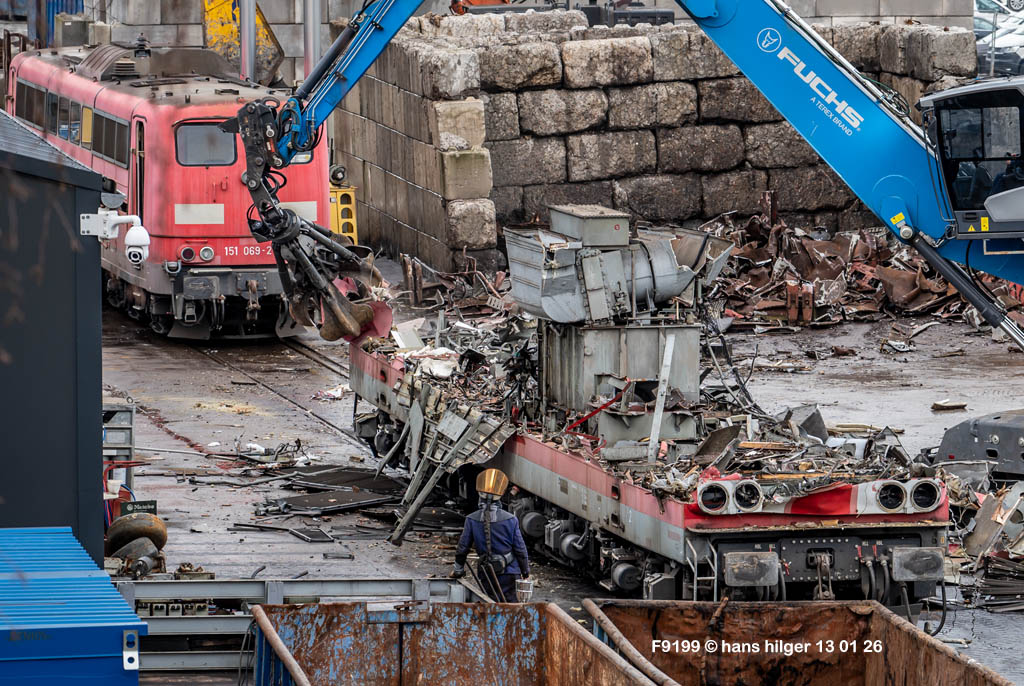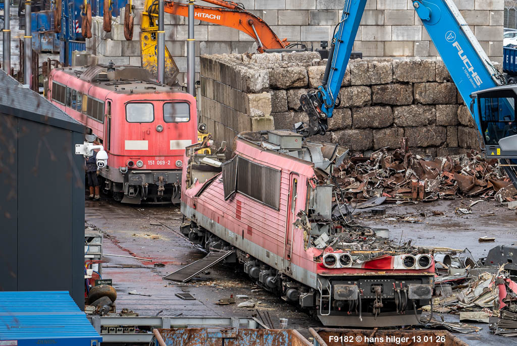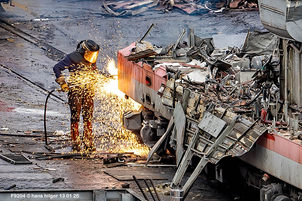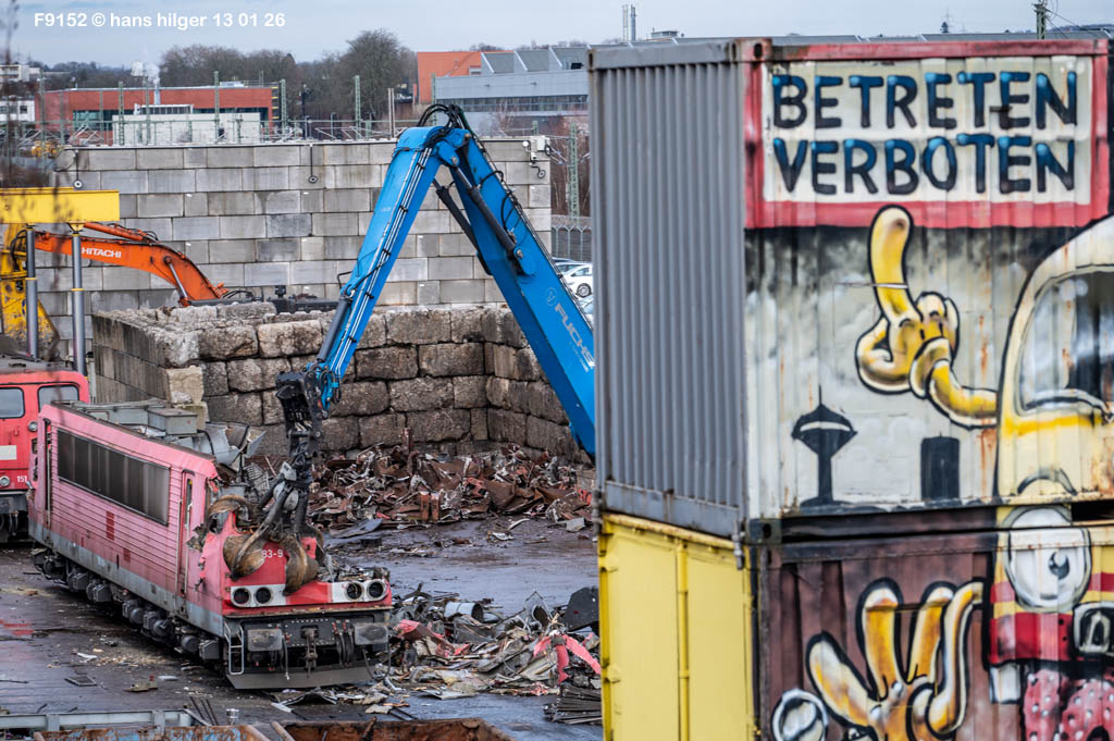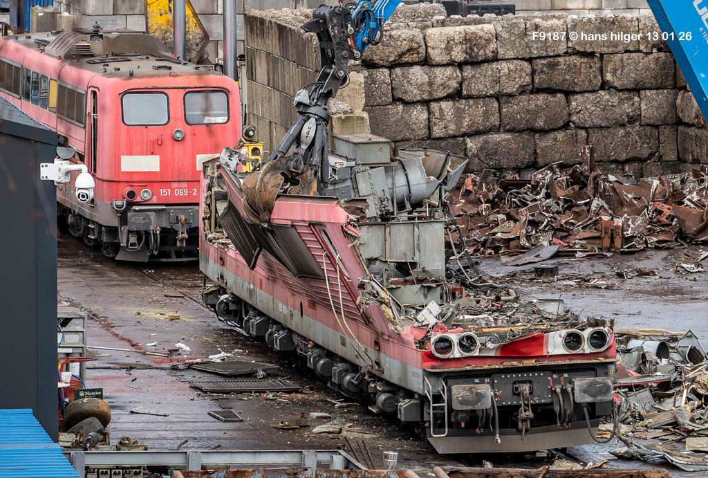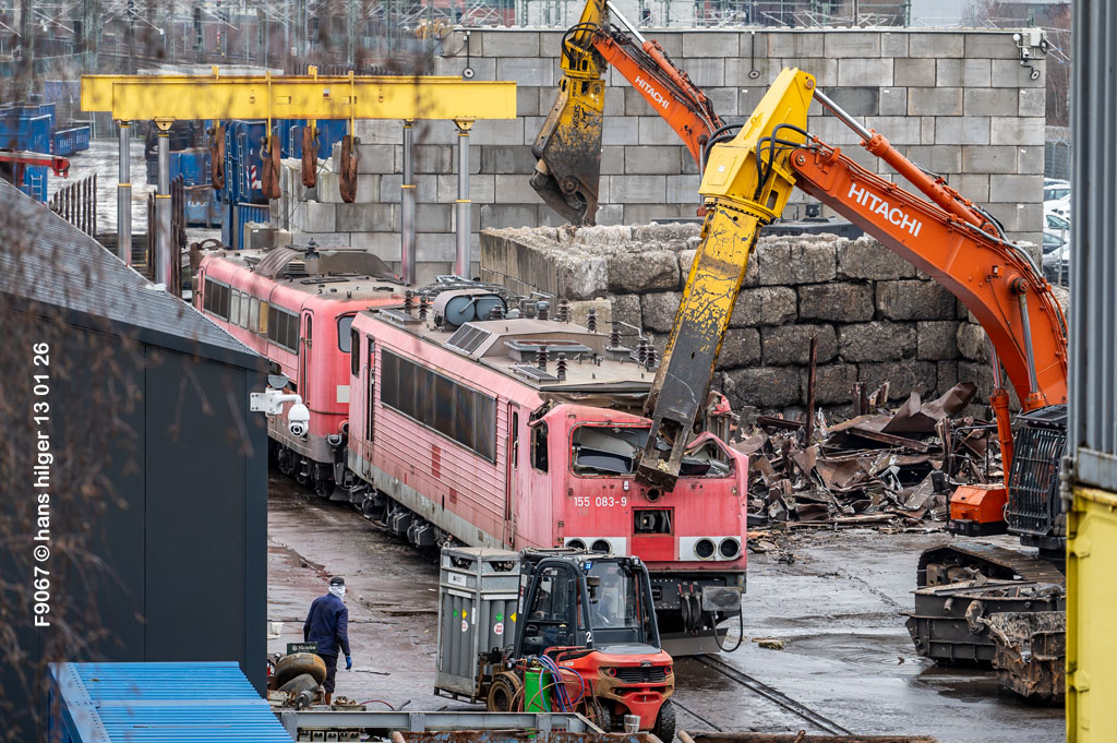 Diese Verschrottung vom 13. Januar 2026 konnte mehr oder weniger zufällig eingefangen werden: Grundsätzlich ist es nicht kalkulierbar, wann eine angelieferte Lok wirklich klein gemacht wird, oft war die Anreise nach Opladen vergebens oder wurde abgebrochen, wenn Fotografen sichtbar wurden. Dieses Mal hatte ich Glück und die komplette Zerlegung konnte dokumentiert werden bis zum Abheben des Rahmens, also der Festlegung, welches Zerlegedatum in der Statistik eingetragen wird = An diesem Tag also hatte ich die Ehre, das Datum zu definieren, das für alle Zeiten das Ende der 155 083 beschreibt. Diese Doku steht auch beispielhaft für mehr als 3000 andere Zerlegungen, die hier bereits stattgefunden haben beim Verwerter ihres Vertrauens. Bitte sehr: Das Ende der 155 083, Vorhang auf . . .