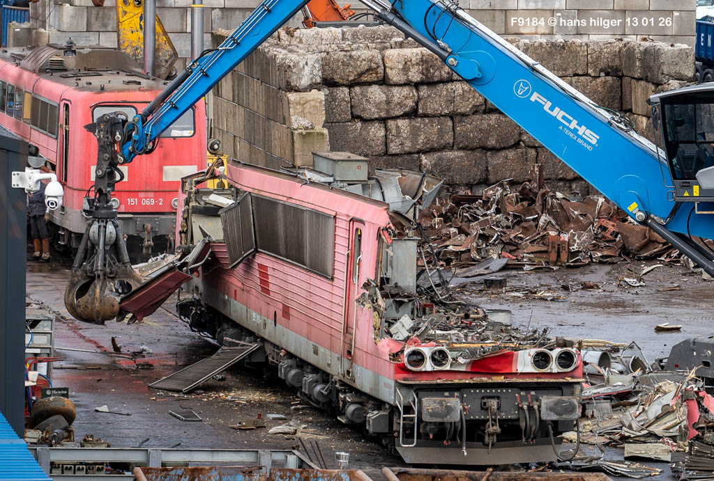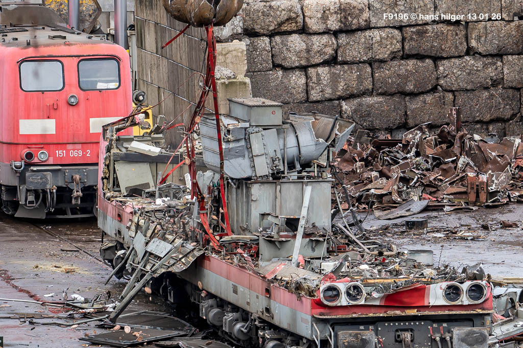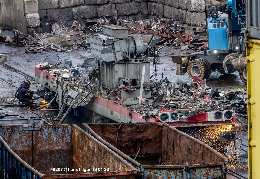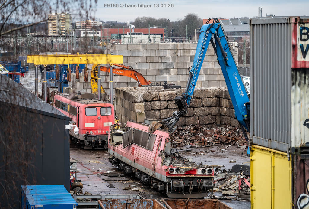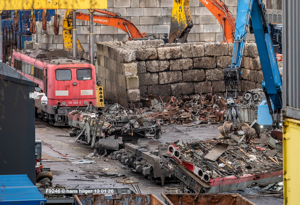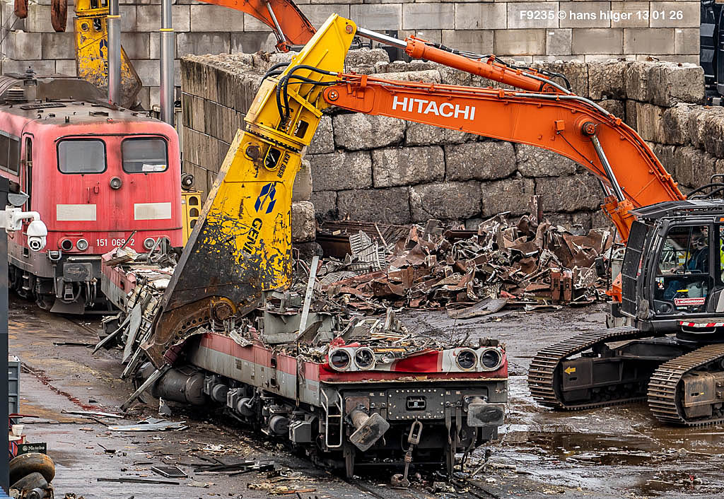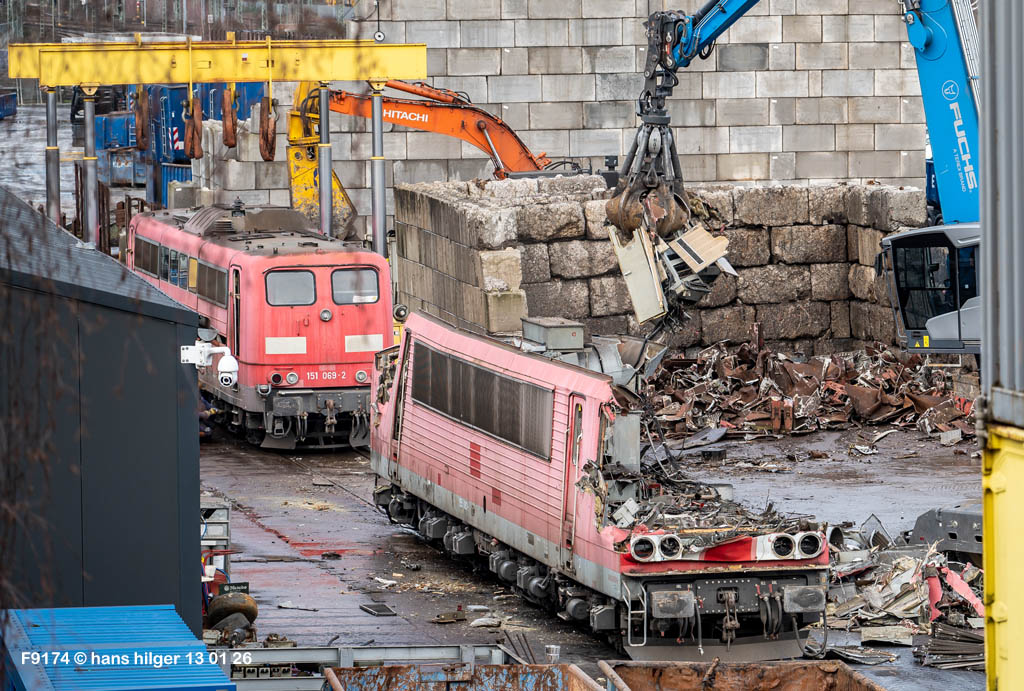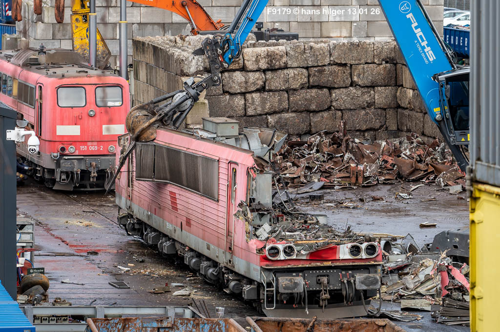 Diese Verschrottung vom 13. Januar 2026 konnte mehr oder weniger zufällig eingefangen werden: Grundsätzlich ist es nicht kalkulierbar, wann eine angelieferte Lok wirklich klein gemacht wird, oft war die Anreise nach Opladen vergebens oder wurde abgebrochen, wenn Fotografen sichtbar wurden. Dieses Mal hatte ich Glück und die komplette Zerlegung konnte dokumentiert werden bis zum Abheben des Rahmens, also der Festlegung, welches Zerlegedatum in der Statistik eingetragen wird = An diesem Tag also hatte ich die Ehre, das Datum zu definieren, das für alle Zeiten das Ende der 155 083 beschreibt. Diese Doku steht auch beispielhaft für mehr als 3000 andere Zerlegungen, die hier bereits stattgefunden haben beim Verwerter ihres Vertrauens. Bitte sehr: Das Ende der 155 083, Vorhang auf . . .