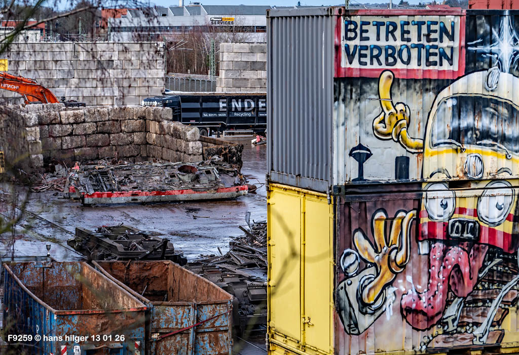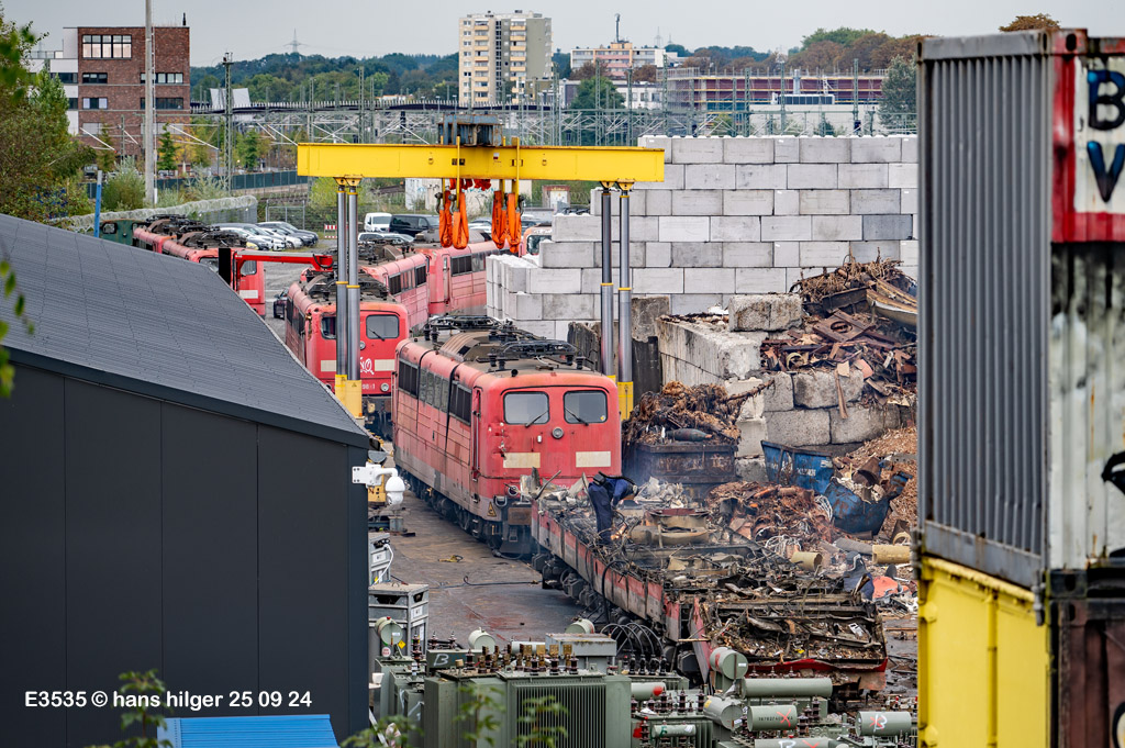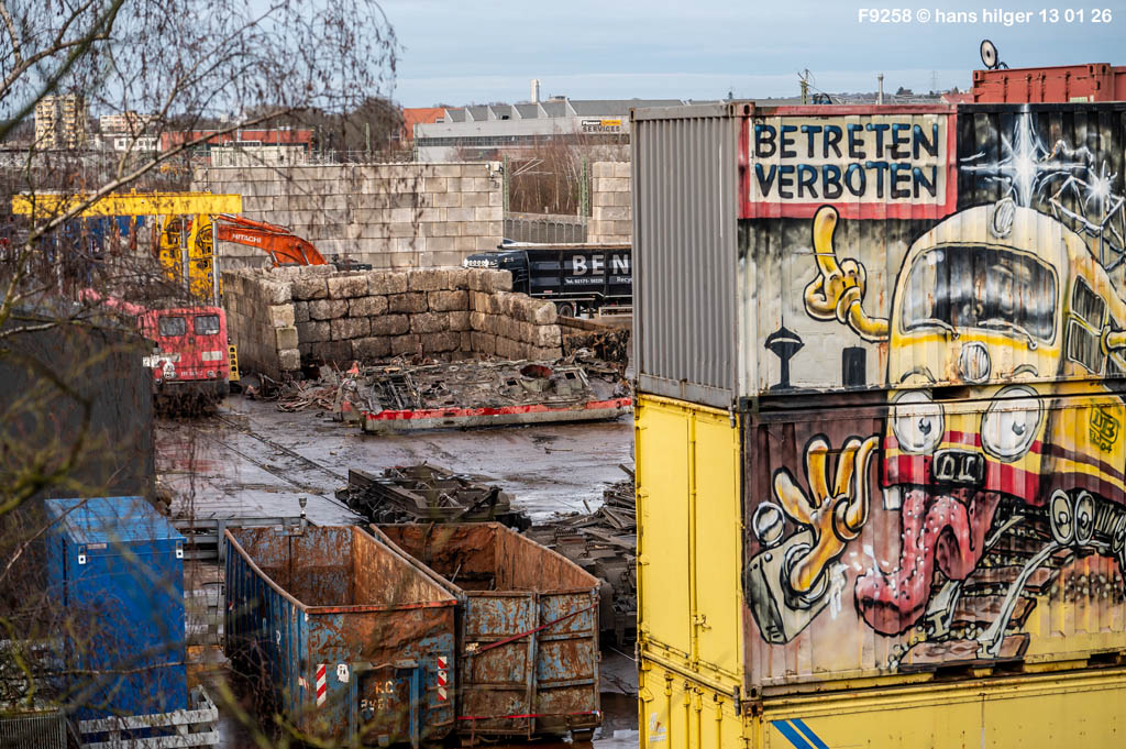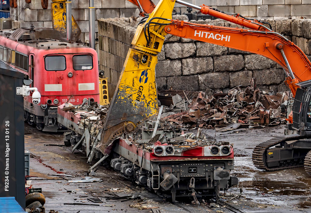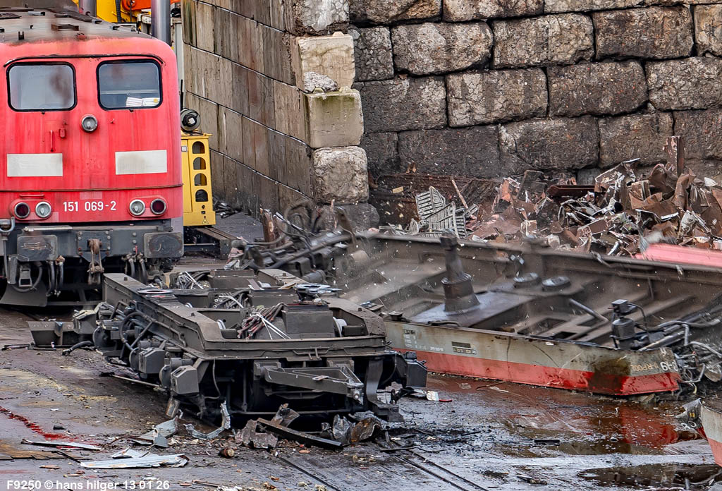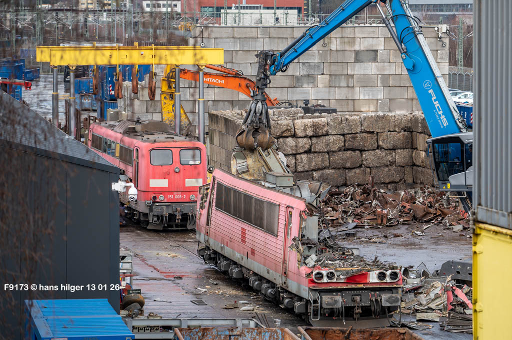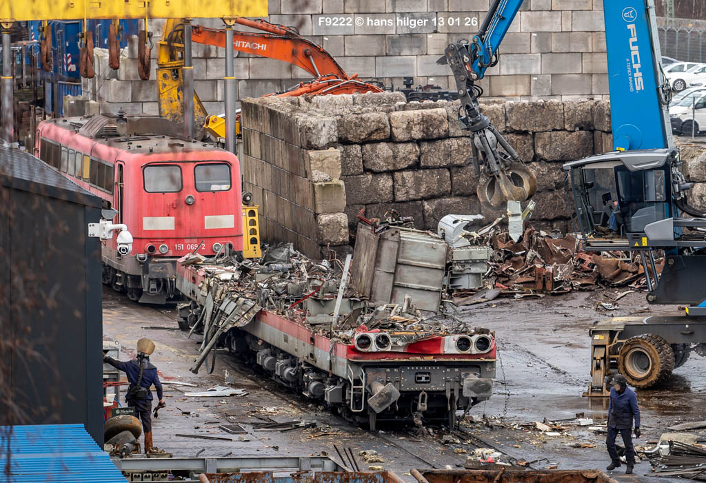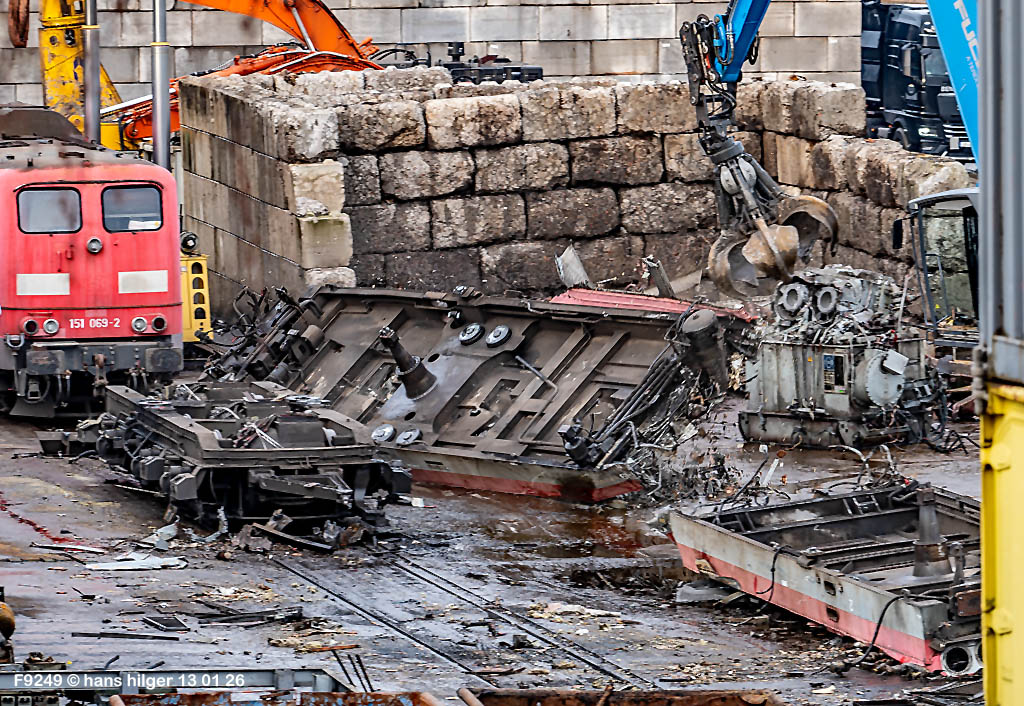 Diese Verschrottung vom 13. Januar 2026 konnte mehr oder weniger zufällig eingefangen werden: Grundsätzlich ist es nicht kalkulierbar, wann eine angelieferte Lok wirklich klein gemacht wird, oft war die Anreise nach Opladen vergebens oder wurde abgebrochen, wenn Fotografen sichtbar wurden. Dieses Mal hatte ich Glück und die komplette Zerlegung konnte dokumentiert werden bis zum Abheben des Rahmens, also der Festlegung, welches Zerlegedatum in der Statistik eingetragen wird = An diesem Tag also hatte ich die Ehre, das Datum zu definieren, das für alle Zeiten das Ende der 155 083 beschreibt. Diese Doku steht auch beispielhaft für mehr als 3000 andere Zerlegungen, die hier bereits stattgefunden haben beim Verwerter ihres Vertrauens. Bitte sehr: Das Ende der 155 083, Vorhang auf . . .