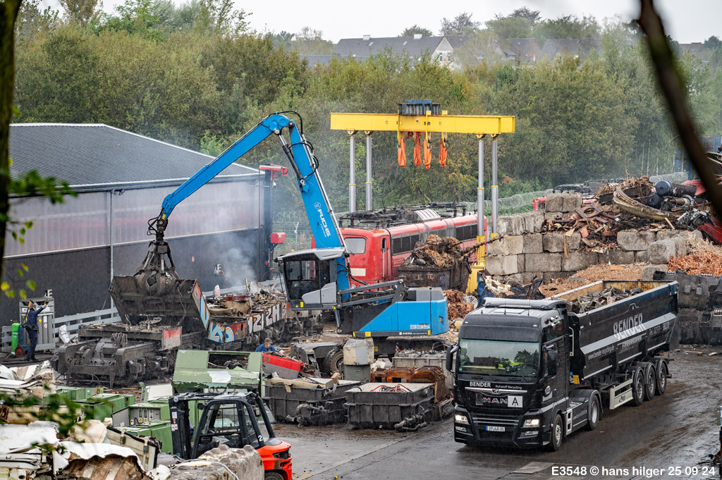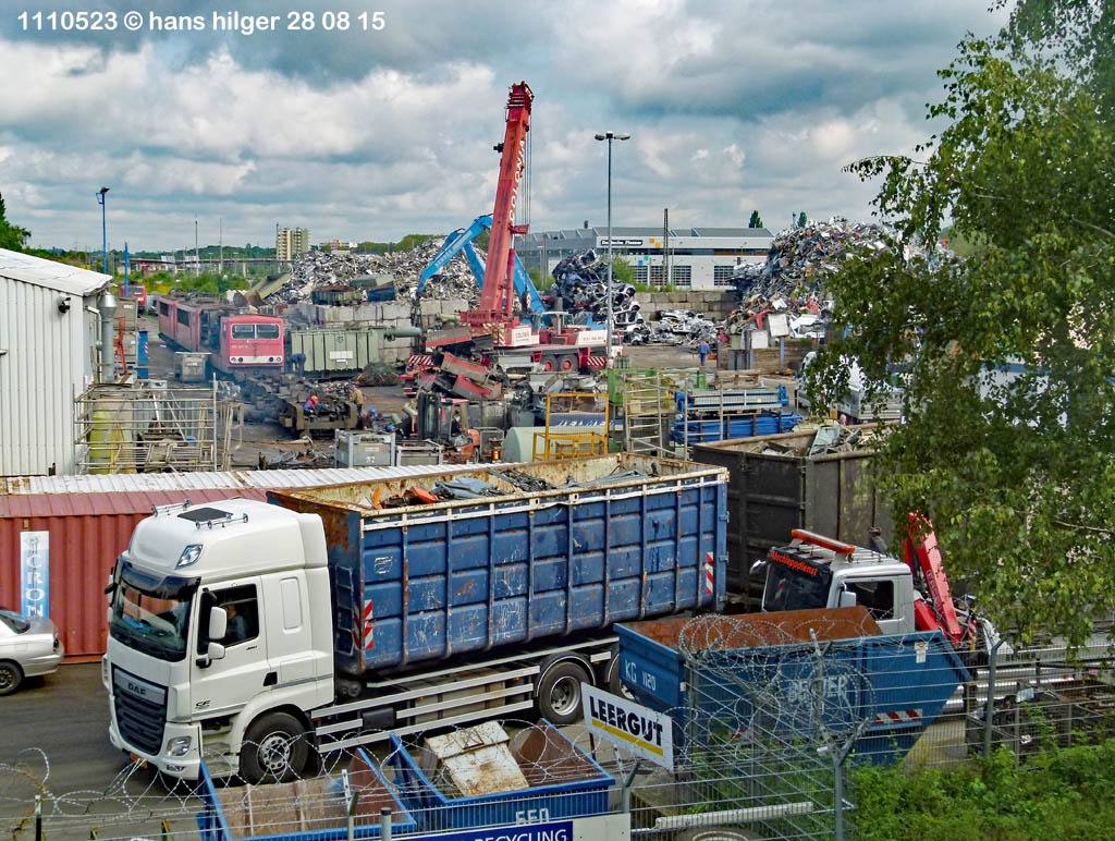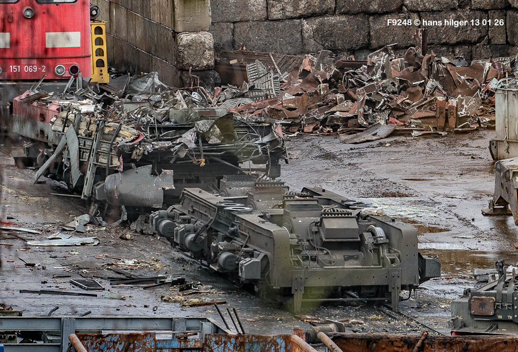 <111> Grundsätzlich kann man aber sagen, daß alle hier zerlegten Lokomotiven und anderen Fahrzeuge, sowie Trafos, irgendwann in solche oder ähnliche LKW- Mulden passen. Früher wurden Reste auch schonmal mit der Bahn abgefahren, seit vielen Jahren wurde dies aber nicht mehr beobachtet. Artenreines Material geht an die Stahlindustrie, Mischmaterial an Shredderbetriebe, nur bei Aluminium hat oder hatte Bender eine Sonderrolle nach meiner Kenntnis: Er verfügt(e) über einen Alu- Shredder, mit dem er selbstgewonnenes Alu in kleine artenreine Stücke verwandeln kann, die sich direkt für die Produktion neuen Aluminiums eignen