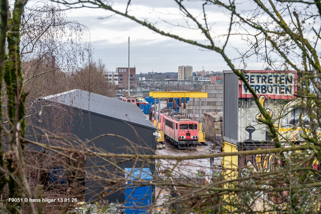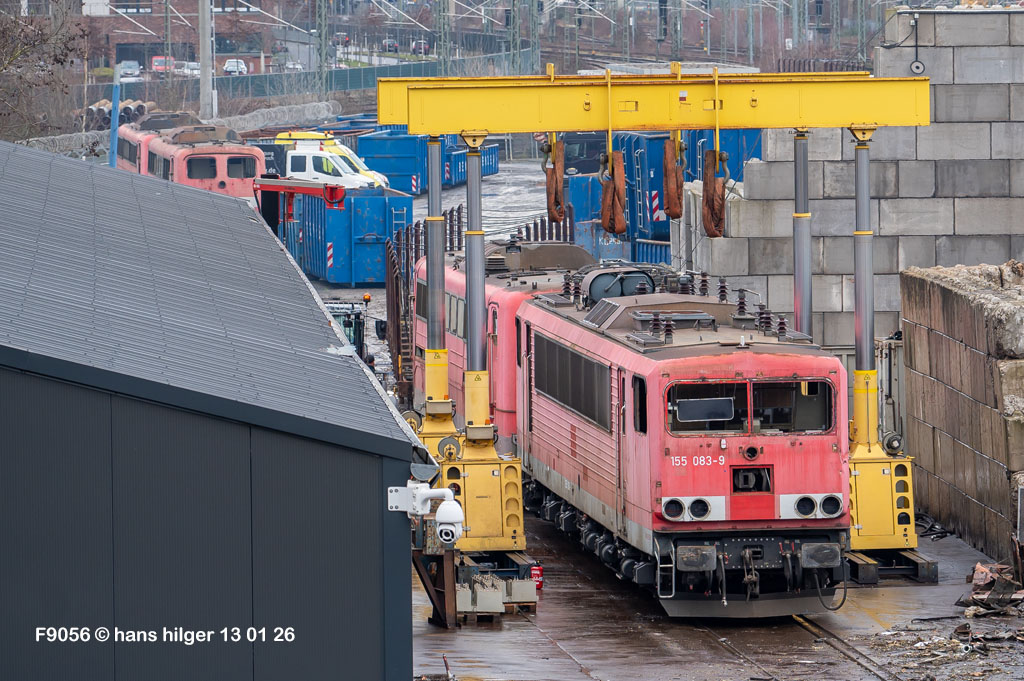 <1> Der Kenntnisstand am kalten Morgen des 13. Januar 2026. Noch konnte Niemand sagen, was gleich passieren werde. Die 155 083 stand mehrere Jahre lang in Leizig- Engelsdorf als Ersatzteilspender, bis ihr Besitzer Railpool keine andere Möglichkeit mehr hatte, sich von ihr zu trennen – Ihre letzte Reise führte dann gemeinsam mit drei ebenfalls als Spender genutzten 151ern nach Leverkusen- Opladen zur Firma Bender. Und dort sind wir gerade