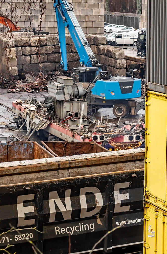 <42> Einige Minuten sind vergangen, in denen ich weiter rechts einen Zug geknipst habe, nun ist die 155 schon viel leerer als gerade noch und der Bagger aus dem Hintergrund ist verschwunden zu anderen Aufgaben. Von irgendwoher hat der Greifer ein Bündel Kabel erwischt