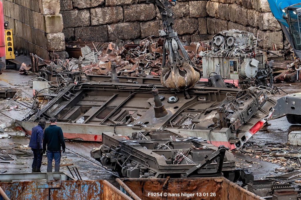 <64> Solche Teile aus eindeutigem, artenreinen Material wurden nebenan sofort in einen LKW verladen, der Haufen, der vor der Lok liegt, ist Mischmaterial, das vor der wirklichen Verwertung bei einem Drittunternehmen noch durch einen Shredder läuft